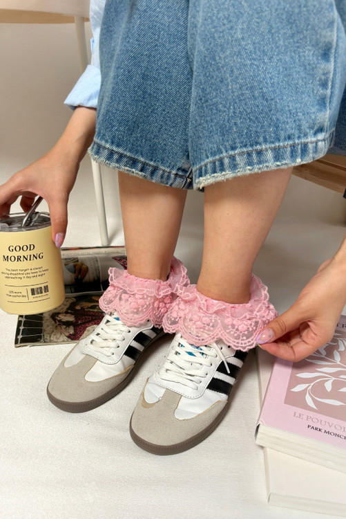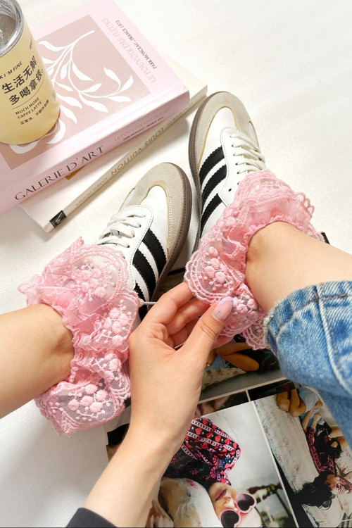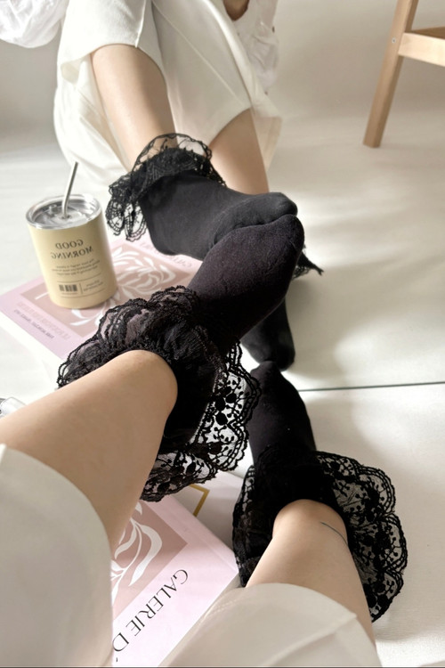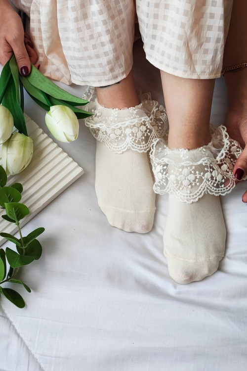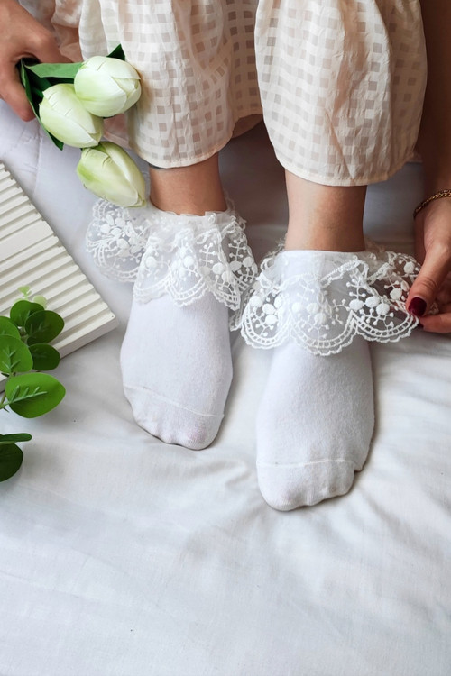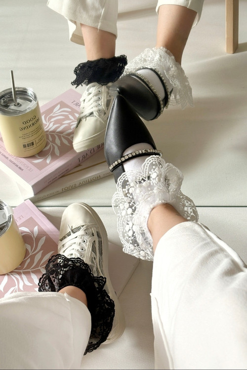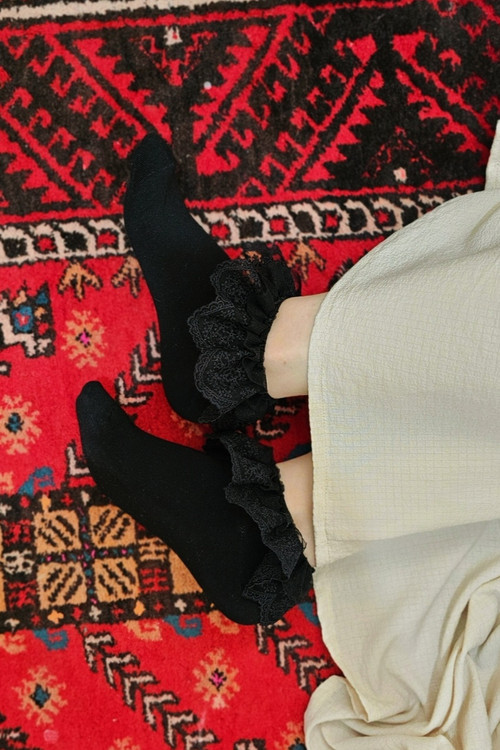 پنجه رسو شده و گیپور سفید دوخته شده دور مچ به طول حدودا یک متر برای هر جفت مصرف شده